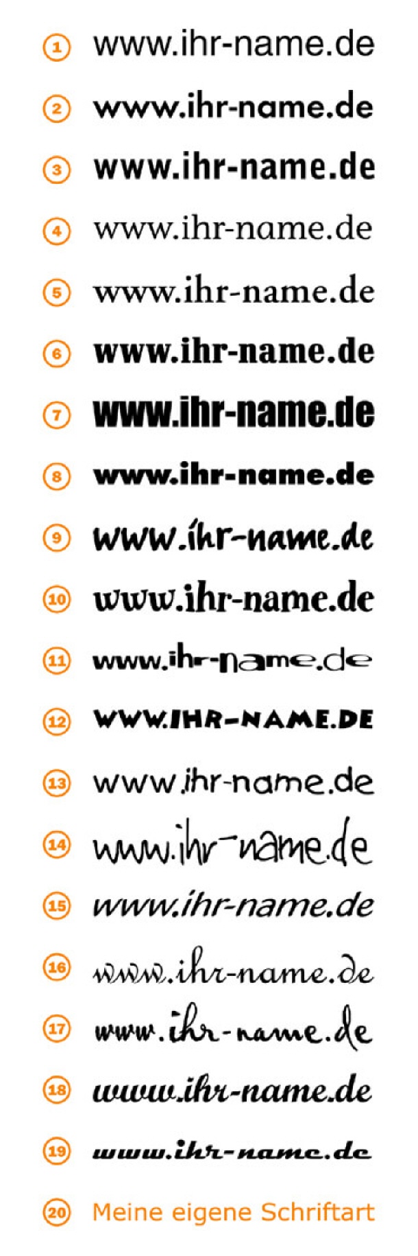 Wählen Sie Ihre Wunschschriftart aus und bestellen Sie die Folienbuchstaben in der von Ihnen gewünschten Farbe. Sollte Ihre Wunschschriftart nicht dabei sein, wählen Sie "meine Schriftart" aus und senden Sie uns Ihre Schriftart und wir plotten Ihren persönlichen Domainaufkleber. Natürlich können Sie auch bei Mehrfachbestellungen Farben mischen, einfach "Verschiedene Farben" in der Auswahl wählen und im Bestellvorgang im Nachrichtenfeld die gewünschten Farben und Mengen der einzelnen Sorten eintragen. Sollten Sie die Aufkleber spiegelverkehrt also für innen klebend benötigen, so tragen Sie dies ins Nachrichtenfeld im Bestellvorgang ein.