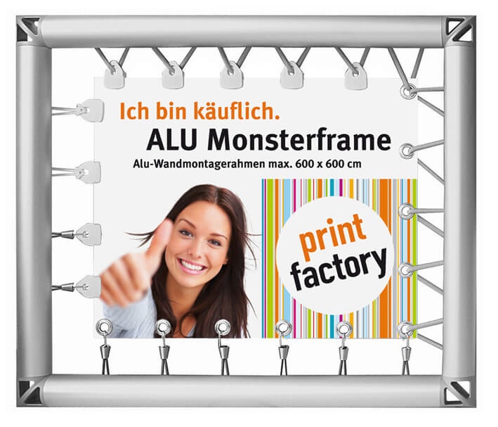 Monsterframe - ist das anwenderfreundliche Befestigungssystem für Werbebanner, Meshbannern, Fahnen ... für den Innen- und Außenbereich. Ideal für Gebäude- und Fassadenwerbung, Messehallen, Kongress und Shoppingcenter, Theater, Museen, Sportveranstaltungen und andere Events. Die Spannbandhalter sind in der rückseitigen Profilnut variabel einsetzbar. Für Megaprints ein echter Vorteil, wenn es um Ihre stilvolle Präsentation geht.