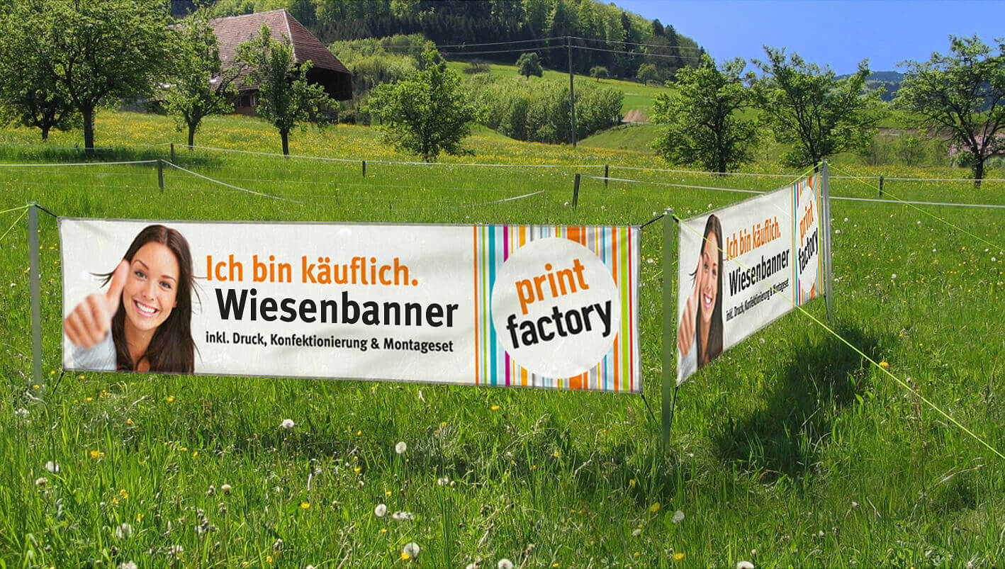Was nutzt das schönste Werbebanner, wenn kein Platz zum Hinhängen da ist. Macht nichts! Mit unserem Wiesenbanneraufsteller wird jede Wiese oder jeder Vorgarten zum Hingucker für jede Aktion oder Veranstaltung. Große Werbung zum kleinen Preis. Sie erhalten zwei komplette Promotionbanner, 4 x 1 Meter aus 500 g/qm Frontlitbanner direkt bedruckt von Ihren Daten. Und dazu gibt es das komplette Wiesenbannerset für 2 Banner inkl. Standfüße, Heringe, Seile, Gummibänder etc. Also los geht's, runter vom Sofa und rauf auf die Wiesn!