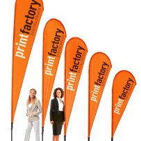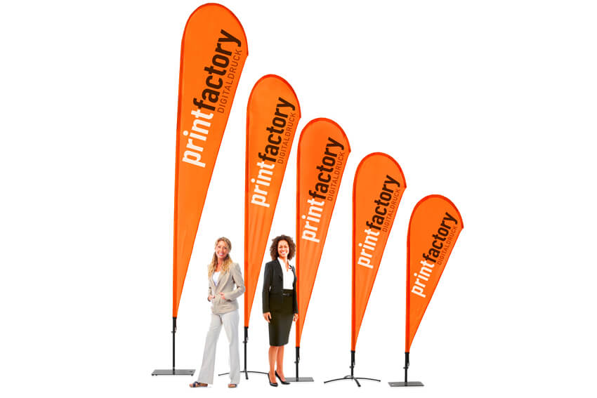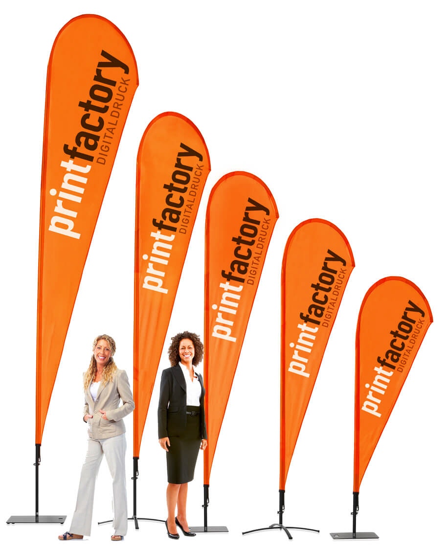 Beachflag printDROP bedrucken lassen. Dropflag bedruckt nach Ihren Wünschen. Erhältlich in 5 beeindruckenden Größen ...Beachflag printDROP unsere Eigenmarke steht den Original-Beachflags in nichts nach und ist ein Werbemittel der Superlative. Erhältlich in 5 beeindruckenden Größen: 235 cm, 290 cm, 345 cm, 400 cm und 520 cm Gesamthöhe. printDROP ist der ideale Blickfang für Ihre Events. Der weiche Fahnenstoff bewegt sich im Wind und lenkt die Aufmerksamkeit der Passanten auf Ihre Werbung. Beachflag printDROP ist die erste Wahl für Events mit großem Publikumsandrang, Indoor wie Outdoor geeignet. Wählen Sie einfach das benötigte Zubehör zu ihrer Beachflag. Ob Metallfuß, Wassertank oder Erdspieß, Sie wissen am Besten wo Sie ihre Dropflag aufstellen wollen. Beachflag inklusive Druck inklusive Rohrsystem, Transporttasche aus Nylon. Sie benötigen zur Verwendung noch eine Standmöglichkeit nach Ihren Bedürfnissen (siehe unten). Der Druck wird mit umweltfreundlichen Farben im Sublimationsdruck auf Treviera CS Fahnenstoff in 115 g/qm erstellt. Bei diesem Druckverfahren erhalten Sie leuchtende, lebendige Farben und einen 70% igen Durchdruck.
