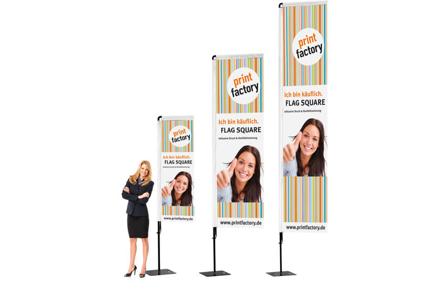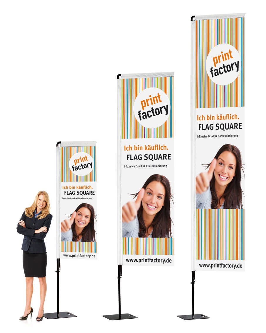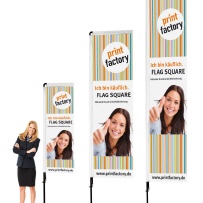 Beachflag printSQUARE unsere Eigenmarke steht den Original-Beachflags in nichts nach und ist ein Werbemittel der Superlative. Erhältlich in 3 beeindruckenden Größen: 240 cm, 350 cm und 460cm Gesamthöhe. printSQUARE ist der ideale Blickfang für Ihre Events. Der weiche Fahnenstoff bewegt sich im Wind und lenkt die Aufmerksamkeit der Passanten auf Ihre Werbung. Beachflag printSQUARE ist die erste Wahl für Events mit großem Publikumsandrang, Indoor wie Outdoor geeignet. Wählen Sie einfach das benötigte Zubehör zu ihrer printSQUARE. Ob Metallfuß, Wassertank oder Erdspieß, Sie wissen am Besten wo Sie ihre printSQUARE aufstellen wollen. Druck inklusive Rohrsystem, Transporttasche aus Nylon. Sie benötigen zur Verwendung noch eine Standmöglichkeit nach Ihren Bedürfnissen (siehe unten). Der Druck wird mit umweltfreundlichen Farben im Sublimationsdruck auf Treviera CS Fahnenstoff in 115 g/qm erstellt. Bei diesem Druckverfahren erhalten Sie leuchtende, lebendige Farben und einen 70% igen Durchdruck.