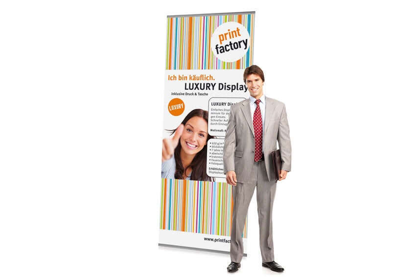 L-Banner Luxury 85 x 200 cm bedrucken lassen. Das edle L-Banner printDISPLAY LUXURY 85 x 200 cm ist ein leichtes, handliches Marketing- und Informationsinstrument, das Design, Funktionalität und Kosteneffizienz vereint. Das L-Banner printDISPLAY LUXURY ist ideal, wenn mehrere Displays benötigt werden, z. B. für Werbekampagnen, Produkteinführungen und Marketingaktivitäten in Geschäften oder Warenhäusern. Das L-Banner printDISPLAY LUXURY wird standardmäßig in einer bequemen Transporttasche aus Nylon mit verstärktem Pappkern geliefert. Durch die leichte Bauweise lassen sich mehrere L-Banner Displays nebeneinander zu einem Motiv vereinen. Somit erstellen Sie ihre Messewände mobil und preiswert. Das L-Banner Display wird mit dem bewährten printDISPLAY-Banner ausgestattet.