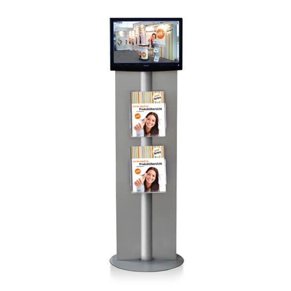Eine der schönsten Arten, Ihre Firma per Film oder Diashow auf Messen oder in Ihrem Foyer zu präsentieren. Das LCD-Display spielt Video-CDs, DVDs , Jpegs ab. Dieses formschöne Aluminium-Display ist mit zwei Acryl-Prospektkörben versehen und mit einem 19 Zoll LCD-Fernseher ausgestattet, mit integriertem DVD Player und Speicherkartenslot für USB-Sticks und SD-Karten. Einfache Bedienung per Fernbedienung. Es läßt sich zusätzlich ein PC anschließen. Die hinteren Blenden lassen sich auf Wunsch bedrucken (im Preis enthalten).