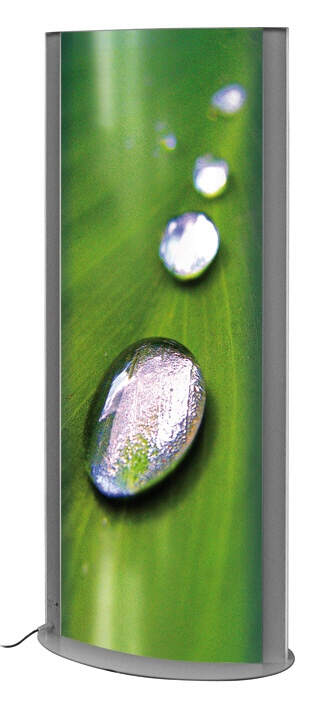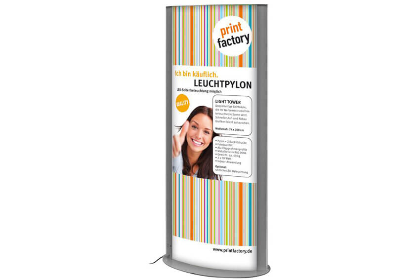 Leuchtpylon groß LED mit Druck bestellen. Elegante, freistehende, doppelseitige Lichtsäule, die Ihr Werbemotiv edel hinterleuchtet in Szene setzt. Der Leuchtpylon bietet eine unkomplizierte Montage und einfachen Transport. Hochwertige silberlegierte Aluminium-Klapprahmen-profile ermöglichen einen leichten Austausch der Grafiken. Inklusive 2 Motivdrucken aus Ihren Daten. Optional können Sie weiße oder farbige LED Akzentbeleuchtungsstreifen an den Seiten dazu bestellen.