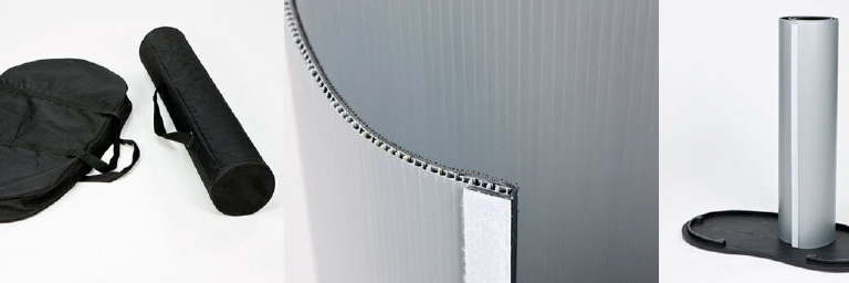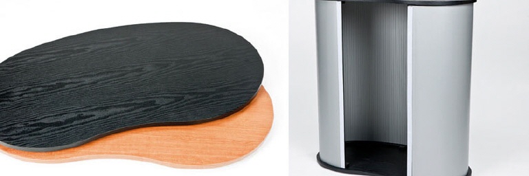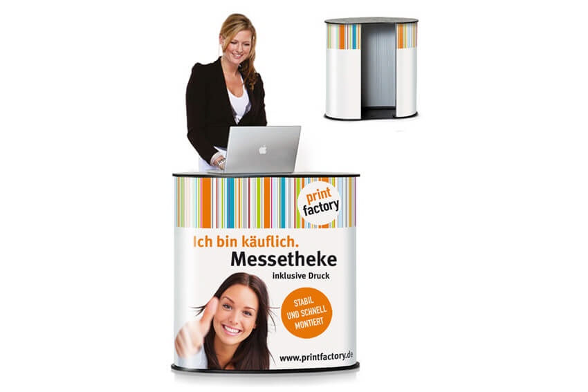 Formschöne Messetheke - extrem stabil mit hoher Standfestigkeit augfrund gekrümmter Form. Sie haben nur 3 Aufbauteile und einen Druck zu montieren. Der Druck wird mit einem rückseitigen Klettstreifen um die Theke gespannt und die Theke zur Abrundung mit einem Holzdeckel ausgestattet. Ideale Präsentations und Messetheke. Thekenplatte in Schwarz oder Holz erhältlich. Inklusive Tasche mit Innenfutter für die Holzplatten und Köchertasche mit Papprolle für Kunststoffrolle und Druck.