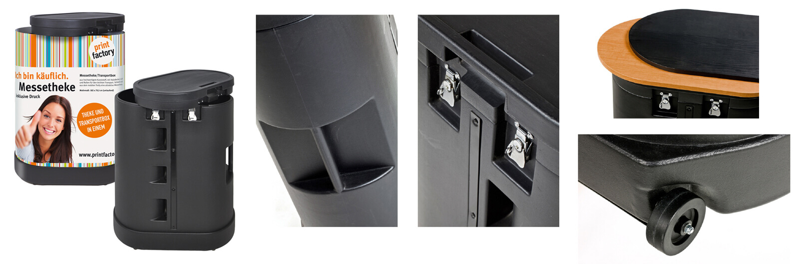 Eine einfach zu handhabende Messetheke die gleichzeitig als Transportbox dient. Aus hochwertigem Kunststoff, mit einem Griff und Rollen für den leichten Transport ausgestattet. In kürzester Zeit haben Sie aus Ihrem Transportmittel eine hochwertige Messetheke gemacht. Der Druck wird mit einem rückseitigen Klettstreifen um die Box gespannt und die Theke zur Abrundung mit einem Holzdeckel ausgestattet. Die Box eignet sich hervorragend zur Aufbewahrung von Prospekten, Demoteilen, Getränken ... und ist mit einem kleinen Vorhängeschloss abschließbar (nicht im Lieferumfang enthalten). Ideal zum Transport und zur Präsentation für Messeveranstaltungen. Sie können neben der Thekenplatte und dem Druck zusätzlich Pop-Up-Systeme, Displays oder Unterlagen usw. zu Ihrem Messestand transportieren.