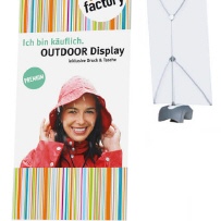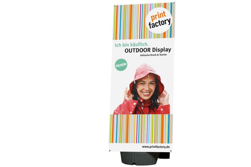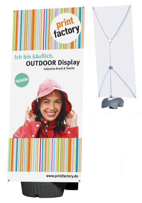 einem großen Wassertank für die Beschwerung. Durch die flexiblen Fiberglas-Grafikhalter kann Wind diesem Display nichts anhaben. Verwindungsarm, UV-beständig. Ideal als Kundenstopper für den Außenbereich, z.B. Fußgängerzone, Parkplatz etc. Das Outdoordisplay kommt komplett mit Wassertank, 2 Taschen, Grafikhaltern und einem wetterfesten Bannerdruck aus Ihrer Datei. Auch Beidseitig erhältlich.