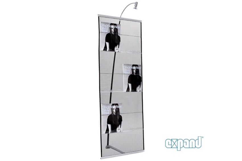 Prospekte und Dokumentationen sind wichtige Verkaufsunterlagen und müssen Ihren Kunden übersichtlich präsentiert werden. Der Expand BROCHURE HOLDER ist unentbehrlich um Informationen effektvoll zu platzieren und griffbereit zu präsentieren. Ideal für Ihren Eingangsbereich oder für den Messeeinsatz.