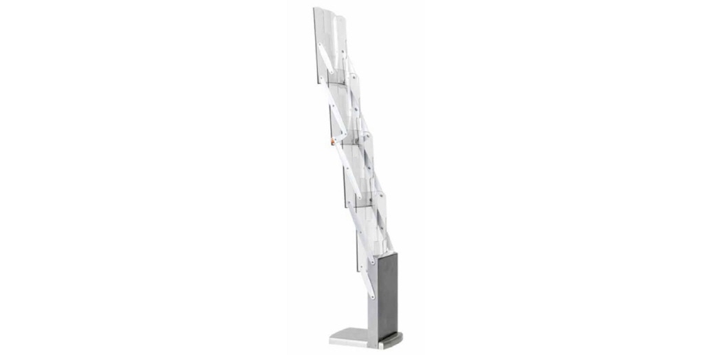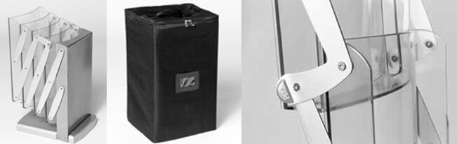 Mobiler, faltbarer Prospektständer mit glasklaren Acryl Fächern. 4 Fächer für Prospekte bis zum Format DIN A4 mit einer Fülltiefe von ca. 4 cm. Besonders ergonomische Form. Das System ist zusammenklappbar und wird mit einer Transporttasche geliefert. Gesamthöhe ca. 160 cm.