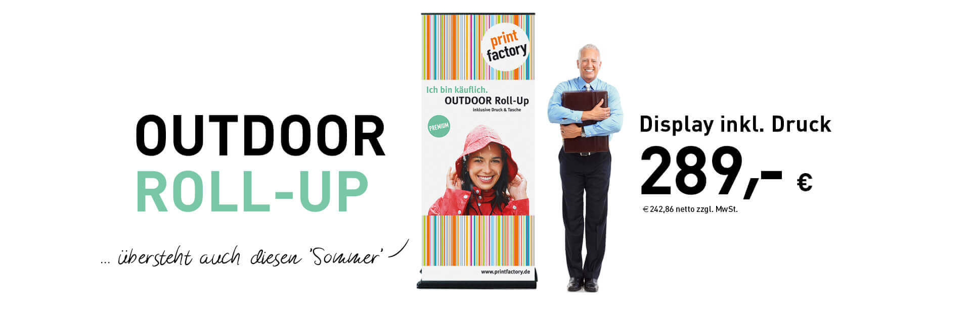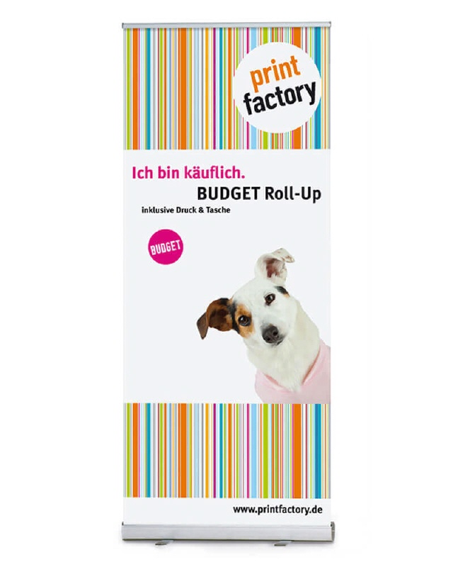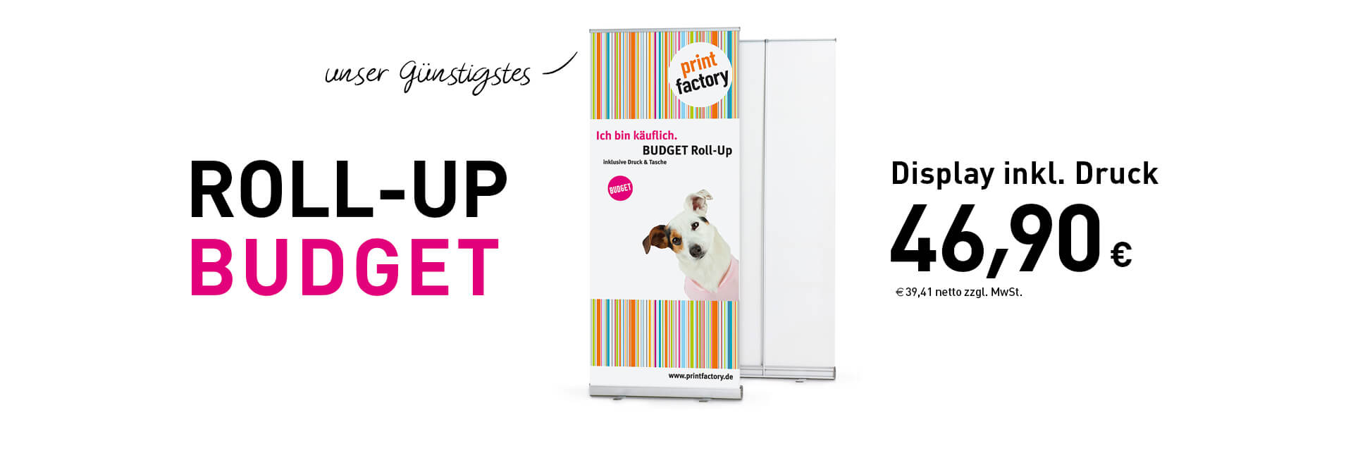 Roll-UP Displays online drucken lassen direkt beim Hersteller. Roll-Up Displays sind die mobilste Art Ihre Werbeaussage in Szene zu setzen. Mit nur wenigen handgriffen gestaltet sich der Auf- und Abbau der Roll-Up Displays kinderleicht. Vergleichen Sie und wählen Sie aus unserer riesigen Auswahl ihr lieblings Roll-Up Displays. Printfactory Roll-Up Displays sind für jedes Budget und jede Anwendung passend. Roll-Up Display printECO schon für 34,90 Euro inkl. MwSt in 85 x 200 cm erhältlich.