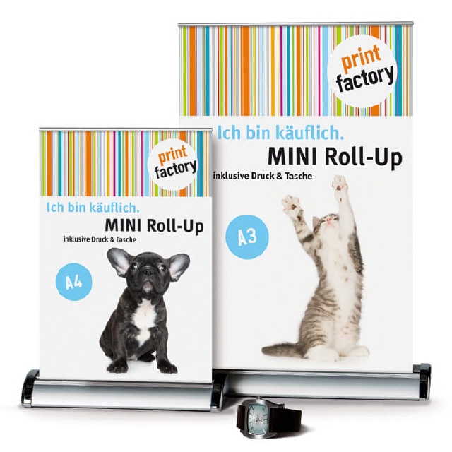 Die Roll-Up Systeme sind kinderleicht zu handhaben - hinstellen, Stange einstellen, ausrollen, einhängen fertig. Keine 30 Sekunden und ihr Roll-Up Display ist der Blickfang auf jeder Messe oder Ausstellung. Als Mini Tisch-Roll-up in DIN A4, Messe-Roll-Up in diversen Größen oder als XXL-Roll-Up in 200 x 250 cm ist für jede mobile Präsentationsform etwas für Sie dabei.