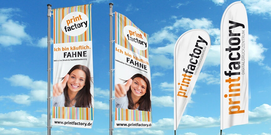 Mit den printfactory Qualitätsfahnen erhalten Sie eine kostengünstige, nachhaltige Werbemöglichkeit für den Außen- und Inneneinsatz ihrer Werbefahne. Fahnen für den Innen- und Außenbereich. Sie haben die Idee – wir haben die Technik.