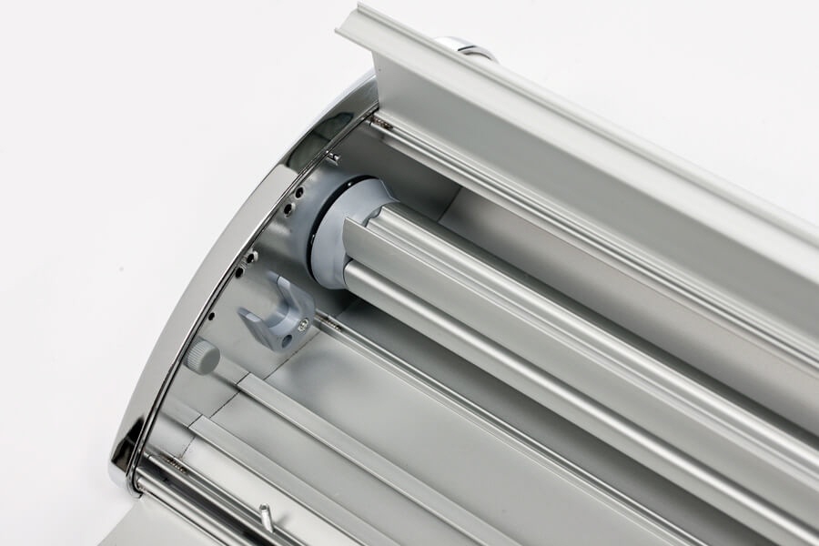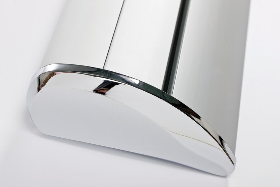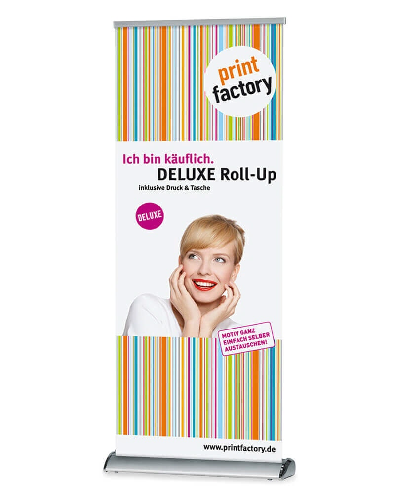printDELUXE ist Das Design Roll UP. Das elegante und robuste Aluminium Roll Up Display mit verchromten Aussenkappen sorgt für einen standfesten Auftritt. Die hochwertige Aluminiumkassette schützt die Grafik beim Transport vor Schäden. Der sehr schnelle und werkzeuglose Auf- und Abbau macht es zum idealen Werbeträger auf Messen und Veranstaltungen. Das Roll Up Display wird mit einer gefütterten Nylon-Transporttasche mit verstärktem Kern zum einfachen Transport geliefert. Das Roll Up Banner ist oben und unten in einer Klemmleiste eingespannt. Sie können das Motiv innerhalb von 2 Minuten selbst wechseln. Dank des verwindungsarmen Bannermaterials bleiben die Seiten des Banners glatt. Das Roll up Display kommt komplett mit Druck aus Ihrer Datei. Das Roll-up-Display Motiv ist höhenverstellbar zwischen 175 und 225 cm. Motivmaß ist 85 x 175 - 225 cm. Auch in der Größe 100 x 175 - 225 cm erhältlich.