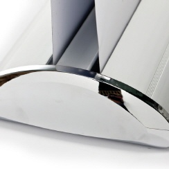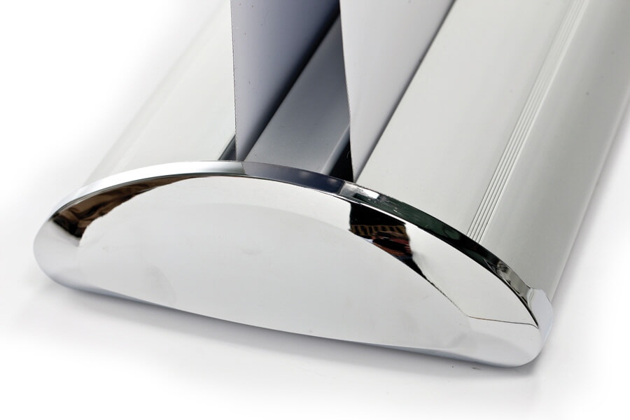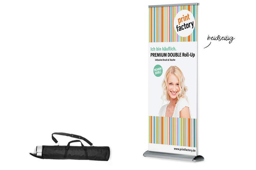 printPREMIUM Double ist Das beidseitige Design Roll Up. Das elegante und robuste Aluminium Roll Up Display mit verchromten Aussenkappen sorgt für einen standfesten Auftritt. Die hochwertige Aluminiumkassette schützt die Grafik beim Transport vor Schäden. Der sehr schnelle und werkzeuglose Auf- und Abbau macht es zum idealen Werbeträger auf Messen und Veranstaltungen. Das Roll Up Display wird mit einer gefütterten Nylon-Transporttasche mit verstärktem Kern zum einfachen Transport geliefert. Die Roll Up Banner sind oben mit einer Klemmleiste eingespannt und unten angeklebt. Dank des verwindungsarmen Bannermaterials bleiben die Seiten des Banners glatt. Das Display komplett mit 2 Drucken aus Ihren Dateien. Motivmaß ist 85 x 200 cm.