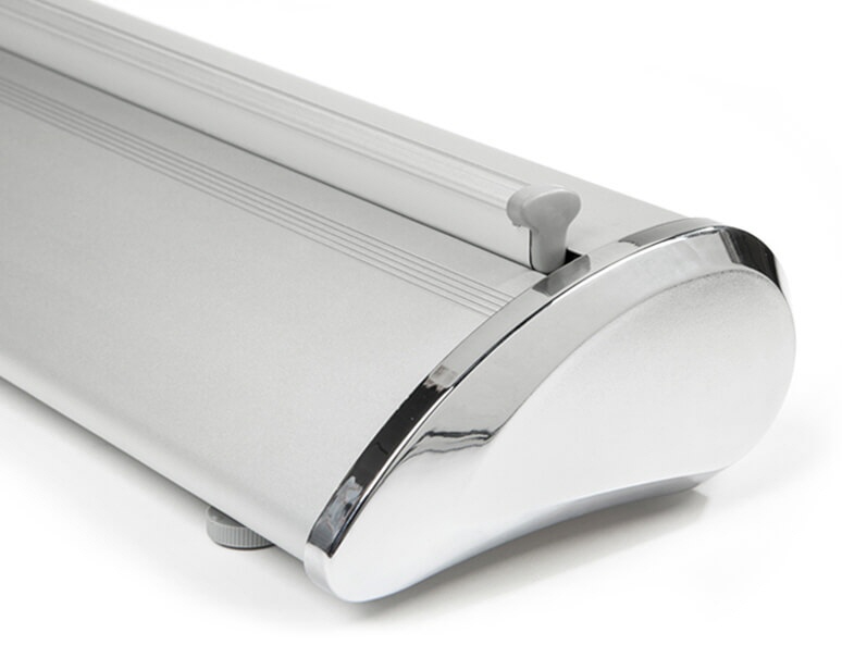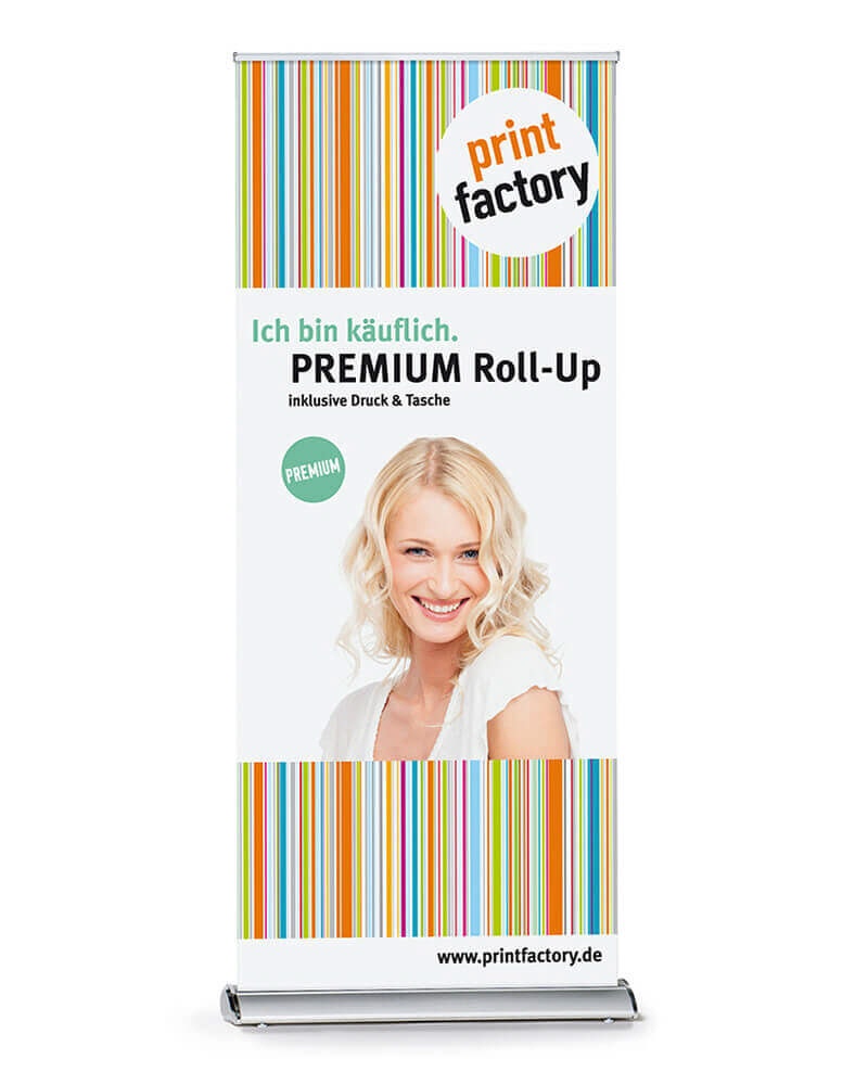 printPREMIUM ist das Design Roll UP zum Top-Preis. Das elegante und robuste Aluminium Roll Up Display mit verchromten Aussenkappen sorgt für einen standfesten Auftritt. Die hochwertige Aluminiumkassette schützt die Grafik beim Transport vor Schäden. Die Roll UP Kassette hat keine Füße. Der sehr schnelle und werkzeuglose Auf- und Abbau macht es zum idealen Werbeträger auf Messen und Veranstaltungen. Das Roll Up Display wird mit einer gefütterten Nylon-Transporttasche mit verstärktem Kern zum einfachen Transport geliefert. Die Roll Up Banner sind oben mit einer Klemmleiste eingespannt und unten angeklebt. Dank des verwindungsarmen Bannermaterials bleiben die Seiten des Banners glatt. Das Display kommt komplett mit Druck aus Ihren Dateien. Die Grafik ist stufenlos höhenverstellbar von 165 x 220 cm. Auch erhältlich in: 100 x 165 - 220 cm, 120 x 165 - 220 cm, 150 x 165 - 220 cm.