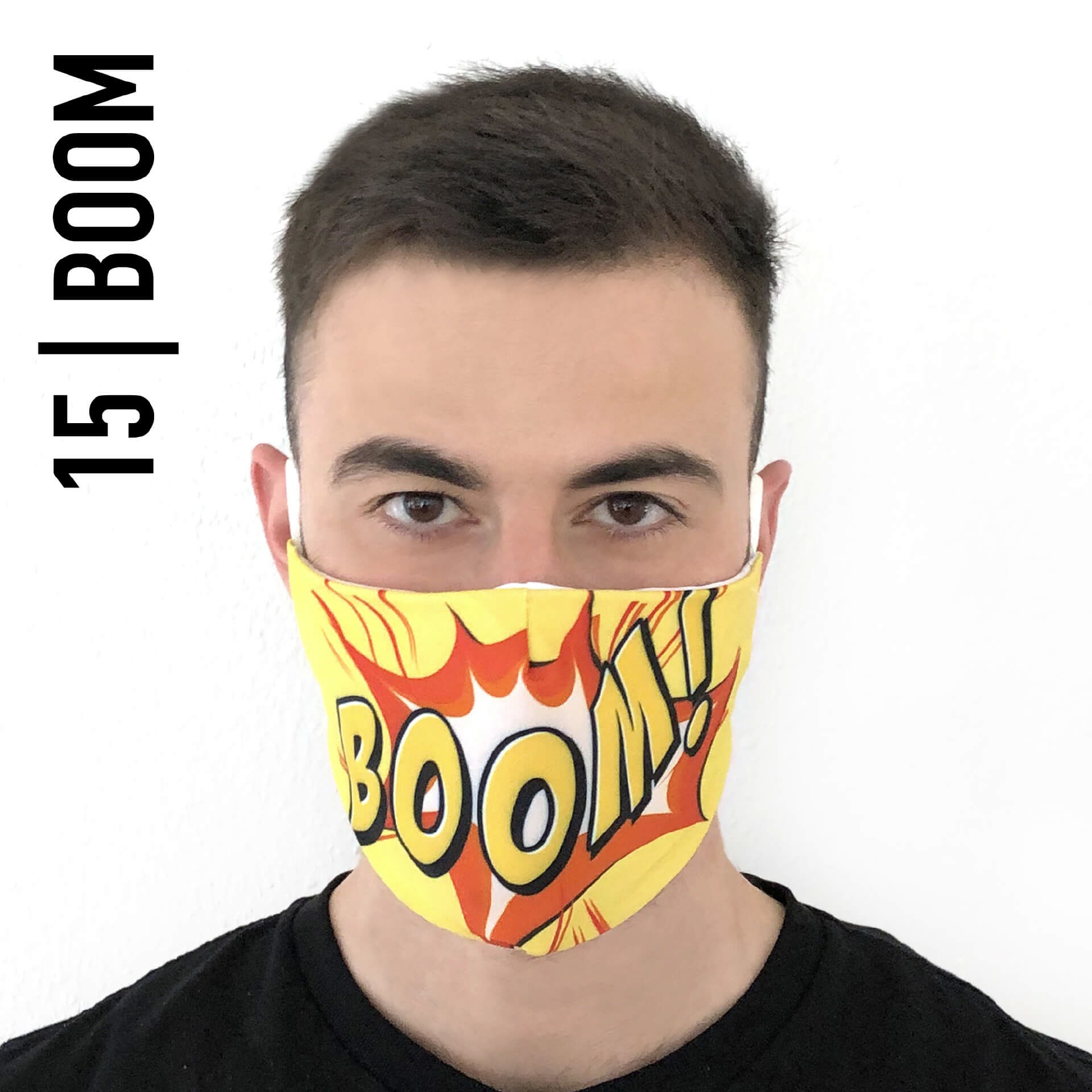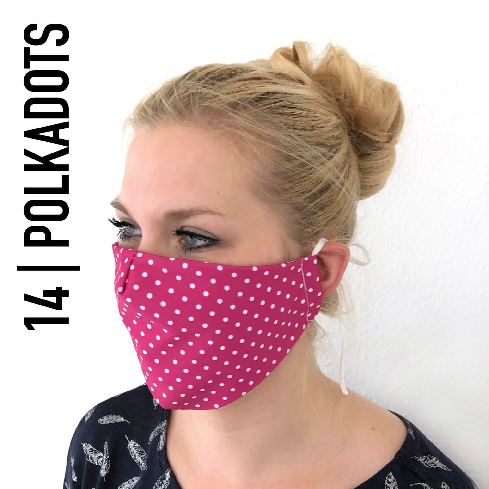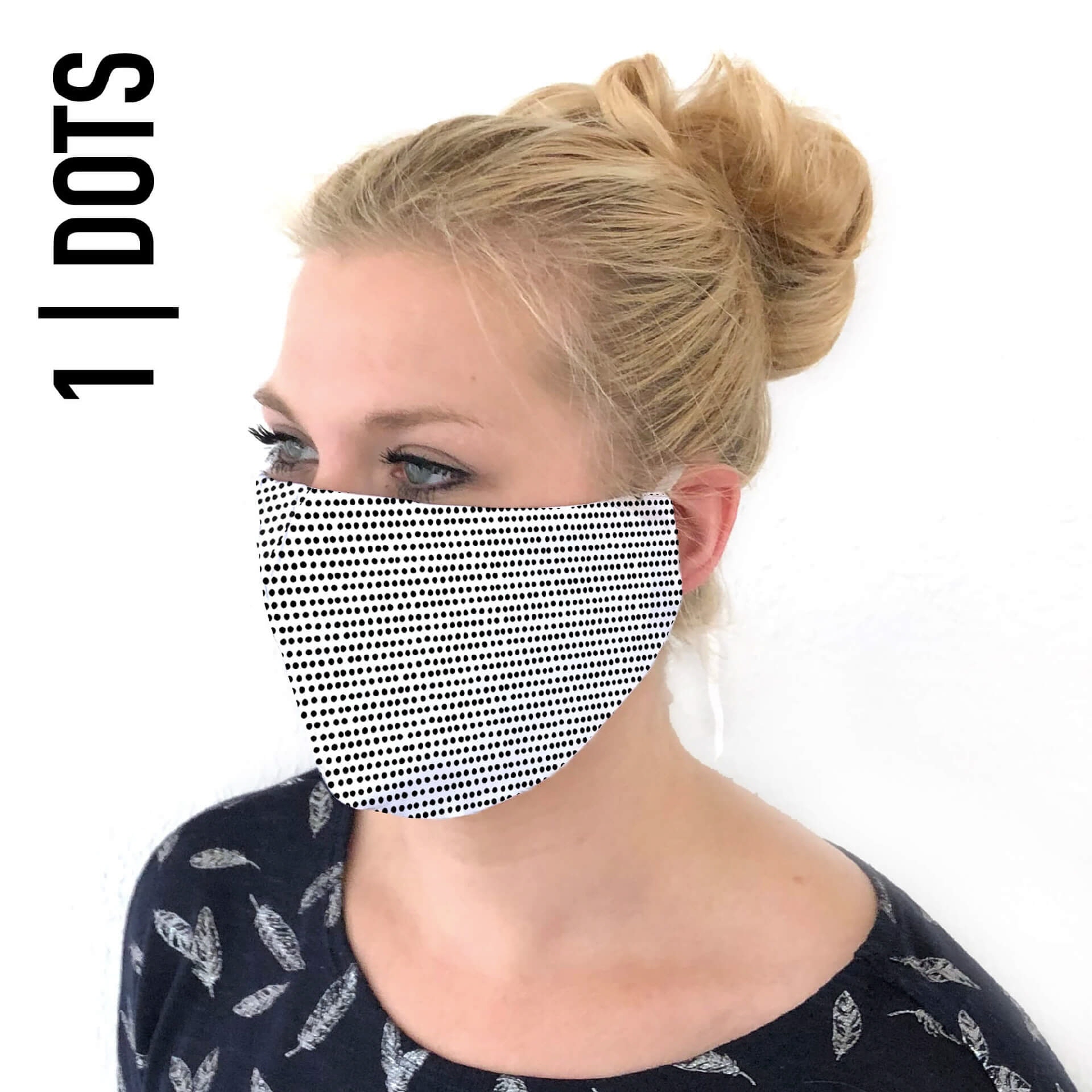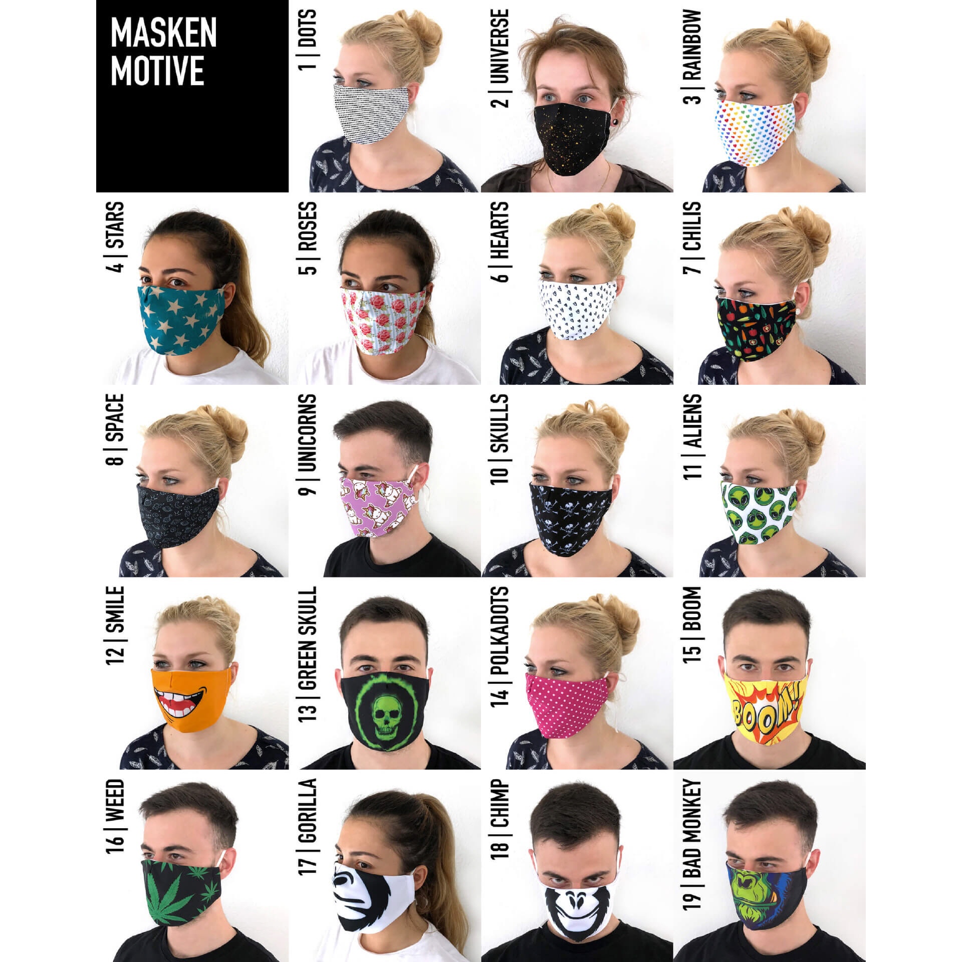 Mehrfach verwendbare Behelfsmaske aus wachbarem Soft-Knit Polyesterstoff, zweilagig. Motiv nach Muster siehe unten. Gute Passform. Professionelle Fertigung. Hohe Qualität. Extrem hohe Tragequalität durch verstellbare Bänder. Keine Druckstellen, da ohne Gummibänder gefertigt. Hohlsaum an den Seiten für Bandwechsel. Bei 60Grad waschbar. Produktion findet bei uns im Hause statt. Wir fertigen ca. 400 Masken täglich. Die von uns angebotenen Behelfsmasken sind keine medizinischen Produkte. Stoff und Druck - Made in Germany - Wählen Sie aus unseren Motiven. Aufgrund der hohen Nachfrage kann es zu Lieferverspätungen kommen. Rufen Sie uns an. 02331-340800