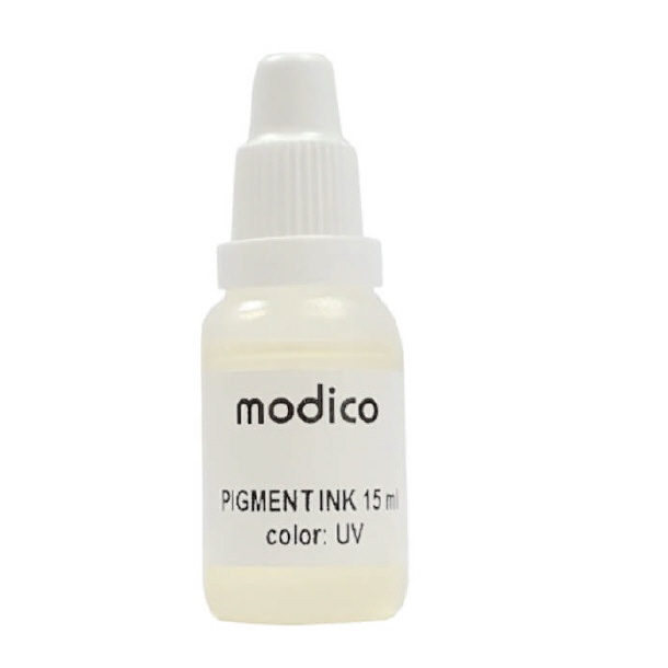 Modico Stempelfarbe UV 15 ml. Leuchtet unter UV Licht. Die modico® Bürostempelfarbe auf Ölbasis zieht rasch in die Oberfläche des Untergrundes ein und ist schnell wischfest. Modico Bürostempelfarbe ist nach DIN ISO 14145-2 als dokumentenecht zertifiziert. Sie kann außerdem gemäß § 29 der Dienstordnung für Notare eingesetzt und somit auch für offizielle Beurkundungen verwendet werden.