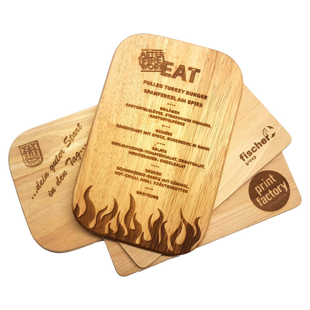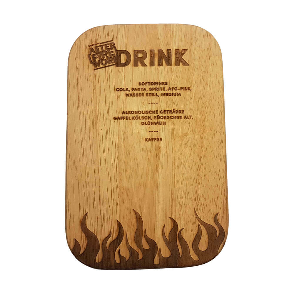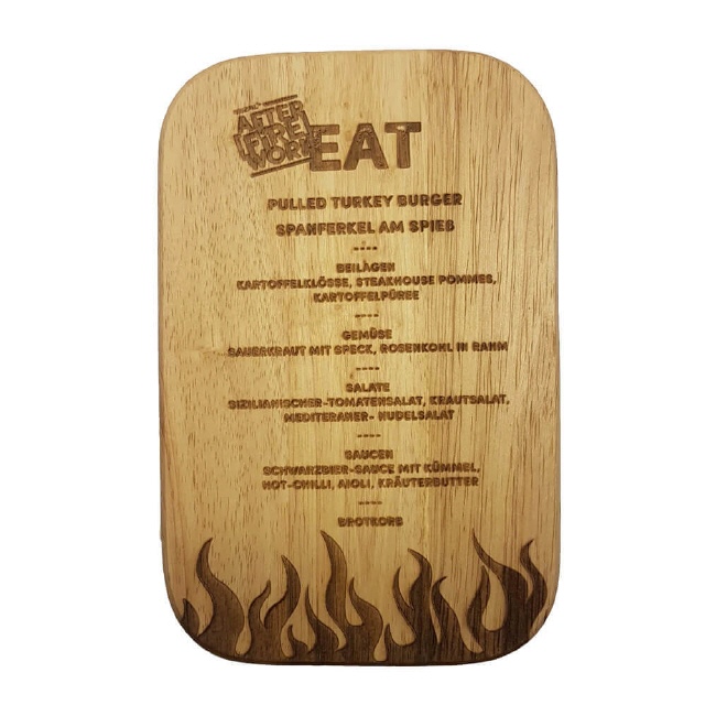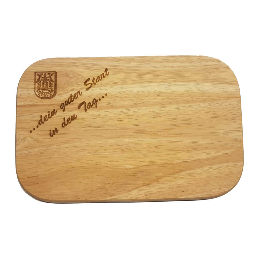 Personalisiertes Frühstücksbrett, aus Buche ca. 8,5 mm dick. Größe 22 x 14 cm. Individuell Laser-graviert. Ausgefallene Motive - Speisekarten etc. möglich. Vor Gebrauch einölen. Ideal als Geschenk. Mehrere Motive möglich.