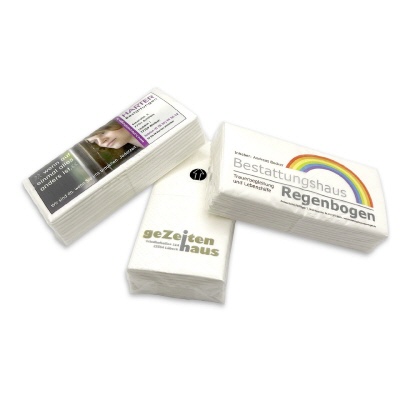 Taschentücher Verpackungen 480 Stück bedruckt nach Ihren Wünschen. Inhalt: 10 Stück. Eine Packung flauschig weiche Viskose Papier Taschentücher sind ihr Wegbegleiter das Jahr über. Das wichtigste Utensil im Winter bei einer Erkältung, im Frühjahr bei Heuschnüpfen, bei Trauer- oder Lachtränen. Ideal als Werbartikel für Apotheken, Beerdigungs Unternehmen, Comedy Events und Arztpraxen.